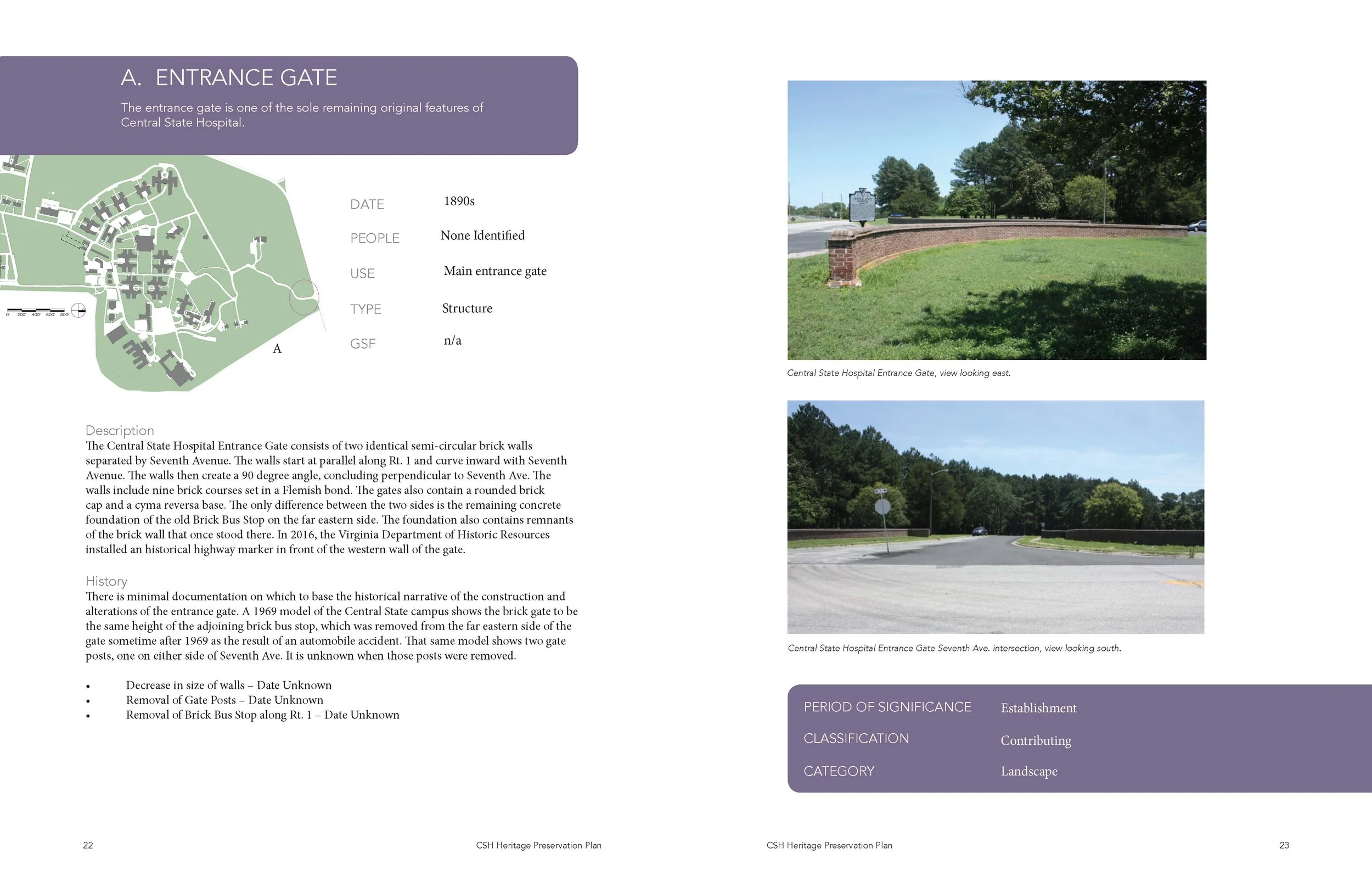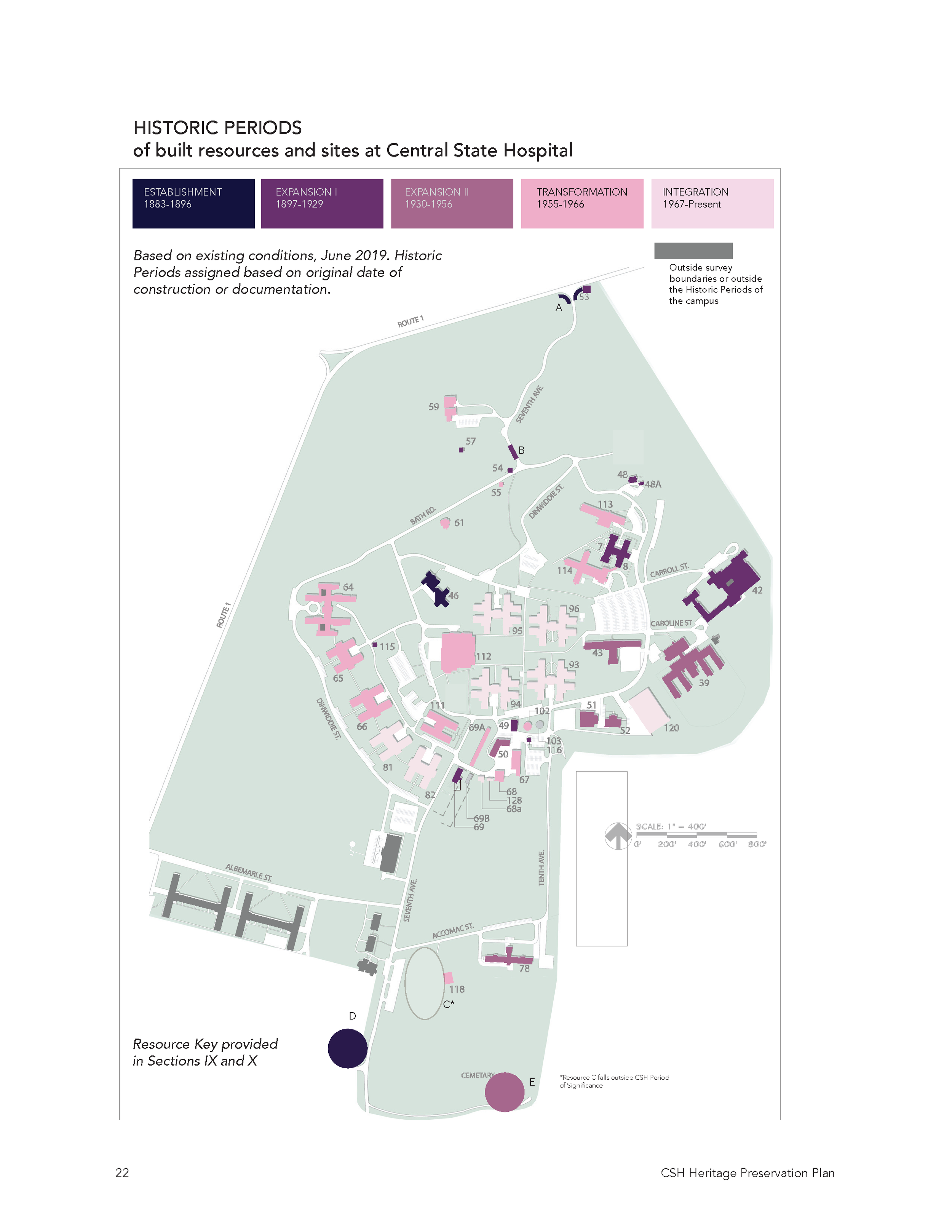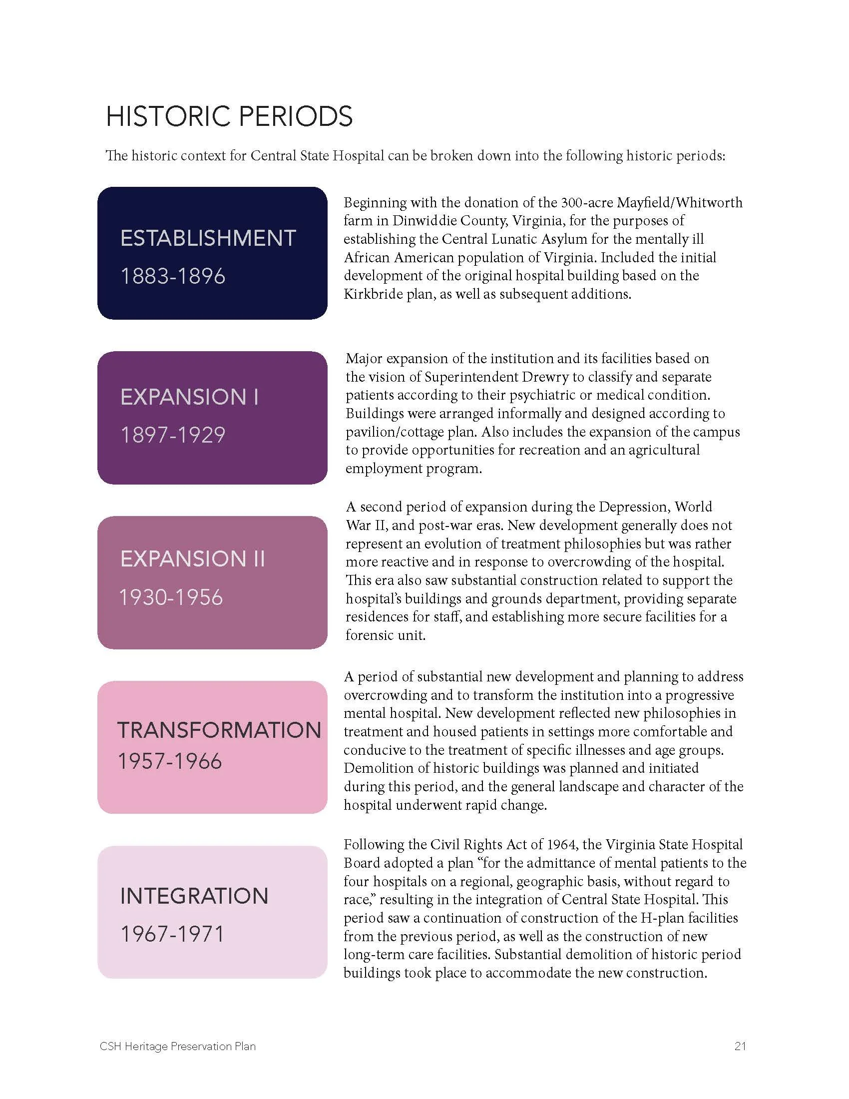 Central State Hospital (CSH) is a 600-acre inpatient mental health facility designed in the Kirkbride plan popular in 19th-century asylums. CSH opened in 1885 as the first dedicated mental health facility for African Americans in Virginia and operated as a segregated facility until 1967. The HPP satisfies a Memorandum of Understanding with the Virginia Department of Historic Resources (VDHR) and guides future decisions on funding, growth, and use within the context of the property’s historic significance.