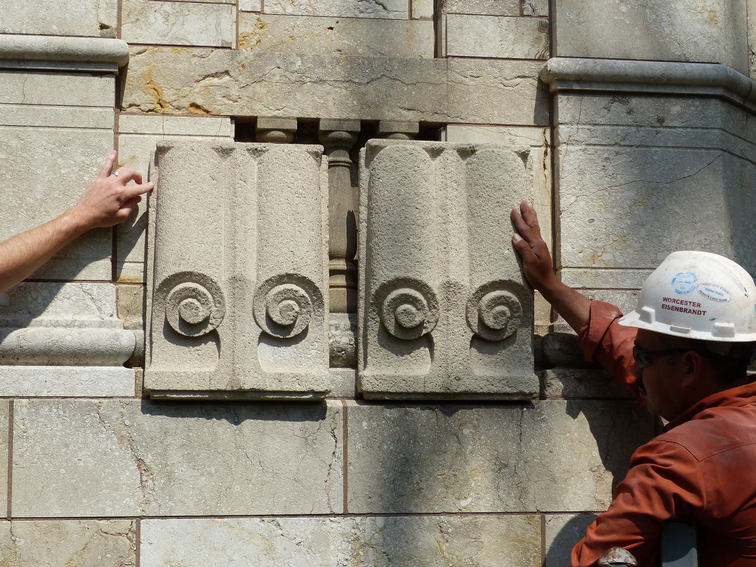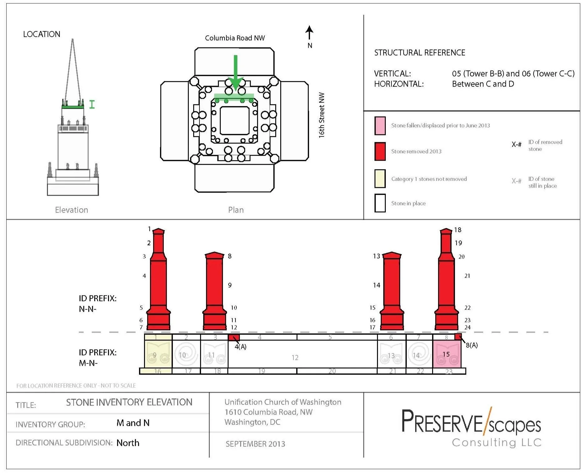PRESERVE/scapes developed and implemented a documentation and consultation strategy that allowed deconstruction to proceed, while ensuring that longterm preservation of the landmark remains possible. PRESERVE/scapes established a comprehensive masonry inventory system that maps over 300 previously removed stones to their original locations on the building and accommodates ongoing stone removal. The inventory is captured in custom graphic tools that will inform reconstruction. PRESERVE/scapes also coordinated with engineers to propose a stabilization strategy that allows contractors to respond to unforeseen conditions in real time, as well as conservators who are working on appropriate patching and substitute materials for this unique stone.